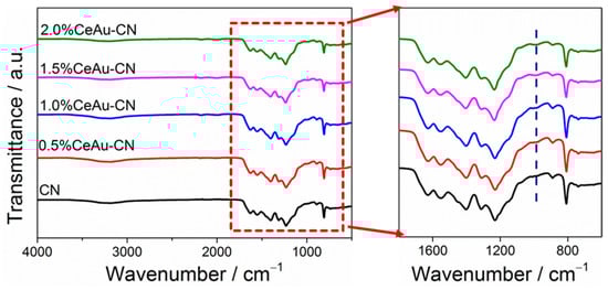 The chemical structure information of the as-prepared materials can be well confirmed by FTIR spectra. In Figure 2, it can be seen that both pure CN and x% CeAu–CN composite materials exhibit similar vibrational modes of triazine heterocyclic ring molecular in polymeric carbon nitride. The characteristic peaks at 1200–1600 cm−1 belong to the stretching vibrations of CN heterocycles, while another significant characteristic peak at 810 cm−1 is caused by the breathing vibration of the triazine units. In addition, a weak broad peak at 2900–3300 cm−1 is attributed to the presence of the free amino group (e.g., NH2 or NH) and absorbed H2O molecules on the surface of the CN-based polymer. Surprisingly, from the partial magnification of FTIR spectra we can clearly see that a new weak band at ~985 cm−1 became more and more obvious with the increasing of CeAu content in x% CeAu–CN composites, probably due to the existence of the stretching vibration of the N-O group [34]. Because of this discovery, it is speculated that the O atom in CeO2 is hybridized with the N atom of CN, indicating the formation of the solid interfacial interaction between the CeAu and CN. The tight interfacial effect contributes to charge transfer, thereby improving the photocatalytic activity to some extent.