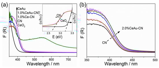 For the optical absorption properties of the samples to be investigated, the UV–Vis absorption measurement was carried out. As displayed in Figure 3a, CN shows an obvious absorption in the visible light region, while CeO2 exhibits optical absorption only in the ultraviolet light region (λ ≤ 400 nm), owing to the intrinsic nature of the samples. Notably, the visible light absorption of CeAu is significantly improved with marked absorption peaks at ca. 550 nm, which is known by common sense to be caused by the SPR effect of the loaded Au nanoparticles. Additionally, in Figure 3b, it can be seen that the optical edges gradually shift to the red wavelength region with the increase in the CeAu content in x% CeAu–CN compositions, but no significant light absorption caused by the SPR effect can be observed, which is mainly because the content of CeAu is too low compared with the urea precursor. Commonly, the band-gap energies of CN and CeO2 are calculated according to the following formula [35]:
