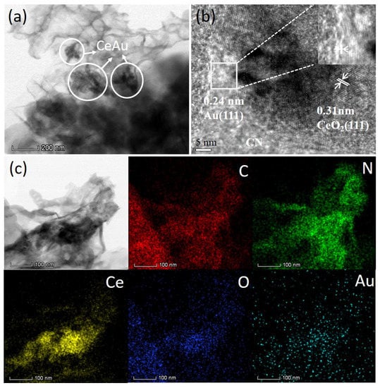 The more detailed morphology and texture information of the samples were investigated by using scanning electron microscopy (SEM) and transmission electron microscopy (TEM). As shown in Figure S1, the SEM image 1.0% CeAu–CN sample exhibits a nanosheet with more porous holes and wrinkles relative to CN, which may benefit the increase in the BET surface areas of the sample. Meanwhile, Figure 4a distinctly shows some irregular CeAu nanoparticles randomly distributed on the surface of the CN photocatalyst. Together with Figure 4b, we can see the obvious lattice fringes with a d spacing of 0.31 nm are consistent with the value for the CeO2 (111) plane. With further enlargement of the selected area, the lattice-fringe spacing of 0.24 nm is observed, which is in agreement with the (111) plane of Au. Furthermore, the EDX element mapping images (Figure 4c) clearly display well-defined spatial distribution of C, N, Ce, O and Au for the 1.0% CeAu–CN photocatalyst. This results, together with XRD analysis, reveal the successful construction of the ternary CeO2-Au–CN hybrids. Notably, there is close contact between CeO2, Au, and CN, which is conducive to the charge transfer across their interface.