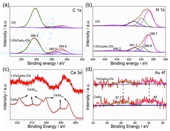 High-resolution XPS spectra of (a) C1s region and (b) N1s region of the CN and 1.0% CeAu–CN composite; (c) Ce3d region and (d) Au4f region of the 1.0% CeAu–CN and CeAu.