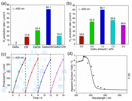 (a) Photocatalytic performance for H2 production of CeAu, pure CN, CeCN, CeAuCN and CeAu+CN; (b) Photocatalytic activity for H2 evolution rate of modified CN with different amounts of CeAu under visible light irradiation (λ ≥ 420 nm); (c) The photocatalytic stability of the 1.0% CeAu–CN; (d) Wavelength dependence of AQY on the H2 evolution in the 1.0% CeAu–CN sample.