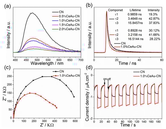 Considering that the photocatalytic performance of photocatalyst is closely related to the charge–carrier separation and transfer process, we performed room-temperature photoluminescence (PL) and photoelectrochemical characterization. The room-temperature photoluminescence was conducted using 380 nm as the exciting wavelength. From Figure 7a, it is clear that all the photocatalysts show similar broad peaks centered at around 480 nm due to the band–band PL phenomenon, which is consistent with the results of DRS. At the same time, the PL emission intensities gradually decrease as the loading content of CeAu increases, which reveals the prohibited recombination of light-excited charge by the construction of heterojunctions. Time-resolved PL spectroscopy was utilized to probe the charge carrier dynamics of pristine CN and 1.0% CeAu–CN composite (Figure 7b). According to the three radiative lifetimes with different percentages, we can obtain the average lifetimes of pure CN and 1.0% CeAu–CN composites as 7.67 ns and 6.27 ns, respectively. Compared with CN, the lifetime of 1.0% CeAu–CN composite is relatively short, probably due to the internal transmission path constructed by Au NPs at the interface or the close interface contact between CN and CeO2, resulting in faster separation of photogenerated carriers. In addition, more charge carrier migration information was also reflected by the EPR analysis of CN and 1.0% CeAu–CN samples. In Figure S6, a single Lorentzian line centering at a g value of 2.003 is observed for CN and 1.0% CeAu–CN samples, indicating the presence of unpaired electrons on π-conjugated CN aromatic rings. Evidently, the EPR intensity of 1.0% CeAu–CN is greatly strengthened compared with CN. This strongly verifies that the modification of CeAu hybrids promotes the electron migration in the π-conjugated system of CN, possibly due to the intimated interface effects of CN and CeAu.