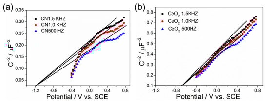 Mott–Schottky plots of (a) CN and (b) CeO2 film electrodes at different frequency in 0.2 M Na2SO4 aqueous solution (pH = 6.8).