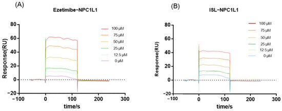 Since NPC1L1 is a transporter protein with no catalytic activity, the inhibitory effect of ISL against NPC1L1 could not be evaluated by conventional colorimetric methods. Thus, the binding of ISL to NPC1L1 was analyzed by surface plasmon resonance (SPR). SPR is a method that can characterize the interaction between target proteins and molecules and has been widely used in drug discovery. According to the response value and SPR trace results in Figure 2, EZ interacts with NPC1L1, and the response value increases with increasing ISL concentration, i.e., the interaction with NPC1L1 is stronger, which is consistent with the previously reported results [29]. ISL also exhibits the same interaction as EZ; the response values increase with increasing concentration, and the interaction is stronger. Therefore, based on the results shown by SPR, the inhibitory effect of ISL can be further evaluated.