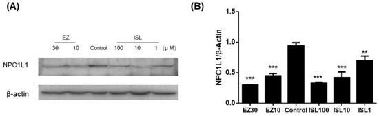 Effect of ISL on NPC1L1 protein expression in HepG2 cells. (A) Cells were treated with different concentrations of ISL for 24 h, and whole cell lysates were analyzed by protein blotting. (B) Analysis of the optical densitometry of the protein blots. ** p < 0.001, *** p < 0.0001.