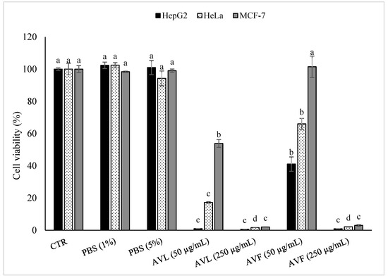 As shown in Figure 3, no significant differences (with α = 0.05) were observed between the control and the samples treated with PBS (1% and 5%), but in contrast, the cancer cell viability significantly decreased (with α = 0.05) with the increase in the plant extract concentration (from 50 μg/mL to 250 μg/mL). Figure 3 shows that all the cancer cells treated with the A. vulneraria leaf extract (AVL) and A. vulneraria flower extract (AVF) at 250 μg/mL presented lower viability values than the cells treated with AVL and AVF at 50 μg/mL.
