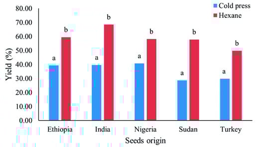 Yield of oil from hexane extraction and cold pressing of sesame seeds with various origin. Different letters (a, b) indicate significant differences between mean values (p ≤ 0.05).