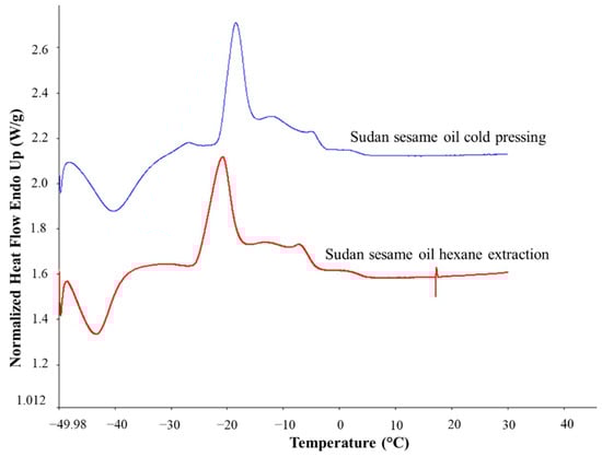 DSC melting curves of sesame oils obtained from extraction by hexane and cold-pressing.