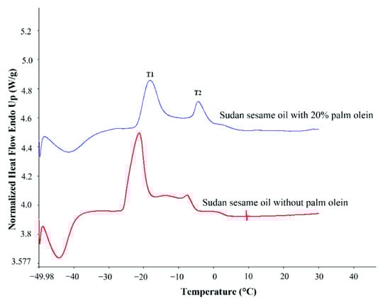 Recently, many alerts from EFSA concerned the authenticity of sesame seeds and its derived products []. The safety of the sesame products imported from outside Europe was questioned. Due to its high price and high demand, sesame oil is susceptible to be adulterated with lower-priced oils. Detection of adulterated sesame oil was previously studied by several methods such as using Fourier transform infrared (FTIR) combined with chemometrics [], detection of fatty acid methyl esters by gas chromatography [], as well as fingerprints determination by ion mobility spectrometry (IMS) []. Compared to previously mentioned methods, differential scanning calorimetry (DSC) offer convenient and rapid method of detection, without the utilization of hazardous chemical and solvent. DSC can measure the amount of heat absorbed and released by food components, such as fat, protein, and carbohydrate. Detection of adulterant in oil using DSC is conducted based on the unique characteristics of fatty acid and triacylglycerol composition [].