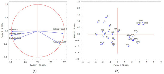 The relation among thermodynamic parameters (% Peak1, ∆Hm Peak1, ∆Hm Peak2, ∆Hm total, and T1/2), as well as scatter plots of sesame products (H, HC, HP, TH), authentic (S) and adulterated (SPO) sesame oils are depicted in Figure 4a,b respectively. Similar study about the implementation of PCA as an authenticity assessment was reported by Tomaszewska-Gras []. Figure 4a visualizes the relations between two first principal components (PC1 and PC2), which described 92.38% of the initial variability. PC1 explains the observed variability in 84.55% and PC2 in 7.83%, which indicates that almost all variables are highly correlated with PC1. In the case of parameter of peak half width (T1/2) there was also correlation to PC2. Additionally, variables such as ∆Hm Peak 1, ∆Hm total, and % Peak1 are positively correlated with each other, and negatively correlated with the rest of variables (∆Hm Peak 2 and T1/2). The observation explains the data presented in Table 5 and Table 6, the greater value of i.e., ∆Hm Peak1, the lower value of ∆Hm Peak2. PCA Scatter plots of DSC thermodynamic parameters of sesame products (H, HC, HP, TH), authentic (S) and adulterated (SPO) sesame oils are presented in Figure 4b. The results show visible distinction between pure and adulterated samples. The objects were separated in two clusters. Pure sesame oils and products were located on the negative side of the X-axis, while adulterated samples were placed on the positive side of the X-axis.