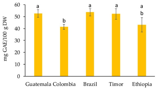 Total phenolic content of spent coffee grounds from different geographical origins expressed in mg GAE/100 g DW. Different superscript letters indicate significant differences (p < 0.05) among spent coffee grounds from different geographical origins.