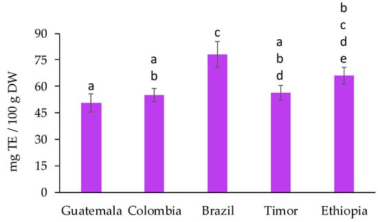 The antioxidant potential of the spent coffee grounds was determined using the DPPH and ABTS assays. Since these two assays use model synthetic radicals which are not directly associated with food or biological systems, frequent objections are raised; however, they are commonly applied due to their simplicity, acceptable repeatability, and low cost. Moreover, the literature demonstrates that DPPH and ABTS are the most preferably employed synthetic radicals in antioxidant assays [34,35,36]. The scavenging of the DPPH, which is a highly colored and stable free radical, is the basis of the popular DPPH antioxidant assay [37]. The values obtained for the DPPH scavenging assay, presented in Figure 3, differed from 50.6 ± 5.3 (Guatemala) to 78.1 ± 7.3 mg TE/100 g DW (Brazil). There were no statistically significant differences among the samples from Guatemala, Colombia, and Timor, while the value obtained for Ethiopia was only significantly different from Guatemala. Brazillian spent coffee grounds presented antioxidant capacity significantly superior to all samples, except for Ethiopia.