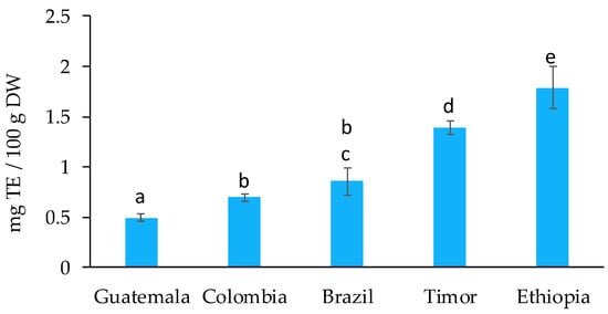 DPPH scavenging assay for spent coffee grounds from different geographical origins, expressed in mg of TE/100 g DW. Different superscript letters indicate significant differences (p < 0.05) among spent coffee grounds from different geographical origins.