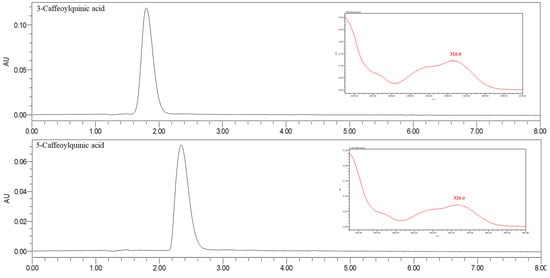 Furthermore, the capacity of the method to produce results directly proportional to the concentration of the analytes was evaluated. The calibration curves were obtained by performing the analytical approach with seven different concentrations of a mix solution of 5-CQA, caffeine, and caffeic acid, ranging from 0.5 to 75 µg/mL. The analytes 3-CQA, 4,5-diCQA, 1,5-diCQA, and 3,4-diCQA were quantified in 5-CQA equivalents. The results of the linearity evaluation are presented in Table 1. Linearity was observed for all the compounds within the concentration range utilized, with the coefficients of correlation (R2) higher than 0.998, proving a satisfactory adjustment of the obtained value to the calibration curve.