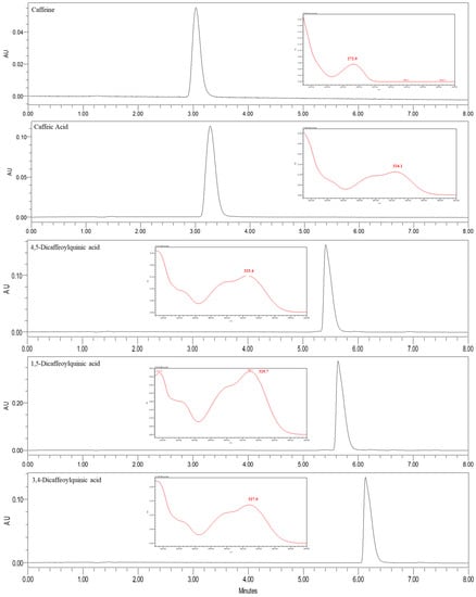 The selectivity of the method was assessed through the comparison of the chromatograms and PDA spectra obtained for the spent coffee grounds UHPLC-PDA analysis with those of analytical standards. The standards used for the identification were 3-CQA, 5-CQA, caffeine, caffeic acid, 4,5-diCQA, 1,5-diCQA, and 3,4-diCQA. The chromatograms obtained from the individual standards used in the identification of bioactive compounds are shown in Figure 5. There were not considerable interferences in the retention times at which the analytes of interest appear, proving that the method is selective and allowing the identification of these analytes in the different spent coffee grounds.