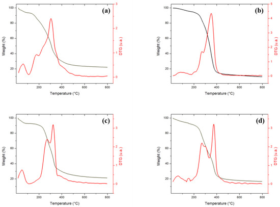 Thermogravimetric curves (TG) and derivatives from the thermogravimetric curve (DTG) are shown in Figure 1a–d. The TG/DTG curves presented a consistent profile for lignocellulosic biomass. At different stages of weight loss, peaks in DTG curves can be seen that refer to the release of water or volatile organic compounds and thermo-decomposition of cellulose, hemicellulose, and lignin [77]. Weight losses observed until 184 °C can be attributed to water evaporation and degradation of organic compounds biomasses, as Baroni et al. (2015) [75]. For temperatures above 200 °C, the behavior of DTG curves is predominantly exothermic due to the decomposition of hemicellulose, cellulose, and lignin into four precursors.