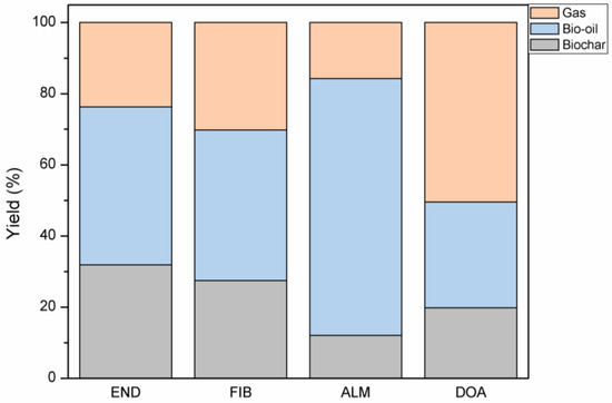 Related to volatile matter (Table 1), Aguiar et al. (2014) [90] reported that in butiá fruits, this parameter depends on maturation grade, climatic conditions, storage time and conditions, and specie of plant. The volatile matter results (Table 1) for the samples FIB and END corroborated tucumã (78.64%wt.) [75], banana trunk (74.33%wt.) [91], and olive kernel (75.8%wt.) [32], while DOA is near to the content of palm shells (62–85%wt.) [92], which has high oil yield like butiá almonds and palm fibers (86.51%wt.) [93] and ALM is near sawdust (90.92%wt.).