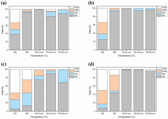 For CO2 production, it was observed that it decreases with temperature, following Chang et al. (2016) [110]. Yang et al. (2007) [97] demonstrate that 500 °C results in higher CO2 production. However, CO2 releases still at 600 °C and 700 °C (Figure 3c), which can be attributed to hemicellulose, but majorly, lignin degradation [97].