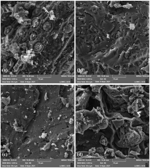 Figure 4 shows the micrographs of biochars. These micrographs show cavities that can indicate a thermal degradation reaction during the pyrolysis process, releasing volatile matter and resulting in a visible porous surface, which was later confirmed through pore distribution analysis. In addition, these SEM micrographs confirm that pyrolysis provides modifications into butiá precursors and shows bumps, cavities, and grooves that are favorable for adsorption purposes [99].