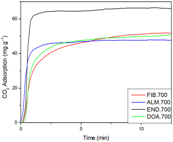 The CO2 adsorption capacity of biochars was tested at 25 °C and atmospheric pressure. The results are shown in Figure 5. END.700 presented a higher adsorption capacity (66.43 mg g−1), and the total adsorption capacity was reached practically in the first minute of the run (58.65 mg g−1) with an increase of 11.7%, from 1 to 11.8 min. Botomé et al. (2017) [124] obtained similar capacity and behavior by employing activated carbon from CCA-treated wood to adsorb CO2 at the same pressure and temperature. It is known that a high surface area and pore volume are needed to improve CO2 adsorption [125], and this process is dominated by micropores [31]. In parallel, at pyrolysis, the higher lignin content inhibits pore formation [115], and the END precursor has the higher lignin content (Table 1). Consequently, END.700 biochar has a low micropores volume (Table 2). Although micropore volume and surface area are important to CO2 adsorption, alkalinity strongly influences this process [31]. Table 2 presents the results for pHPCZ. END.700 shows the highest value (7.34) at the point of zero charges [126]. This observation may explain why END.700 presented a higher capture than other biochars. CO2 is a weak Lewis acid gas, which can interact with the alkaline adsorbent, and lignin is a Lewis base. Thus, the higher content of lignin may explain the increase in CO2 capture. The pHPCZ seems to play a secondary role in CO2 adsorption, Wjihi et al. (2021) [127] reported that a higher pHPCZ resulted in higher adsorption capacity. FIB.700 showed an adsorption capacity of 54.59 mg g−1, ALM.700 presented 48.87 mg g−1, and DOA.700 exhibited an adsorption capacity of 51.76 mg g−1, respectively (Figure 6).