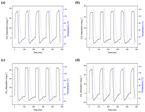 CO2 adsorption cycles in biochars (a) FIB.700, (b) ALM.700, (c) END.700 and (d) DOA.700.