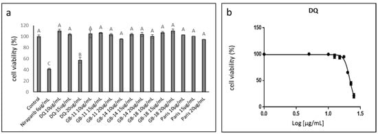 The most active extract, DQ, was fractionated as described in [19]. The activity of the different fractions was tested on HTB75 cells. Four of the 8 fractions (F4, F5, F6 and F7) showed significant cytotoxic activity at the examined concentrations. F5 and F7 were the most active, with the highest examined concentration (20 µg/mL) resulting in ~80% cell death (Figure 2a). F6 and F4 were less active, with the highest examined concentration (20 µg/mL) resulting in ~60% and ~40% cell death, respectively (Figure 2a). Treatments with F1–F3 and F8 showed no cytotoxic activity against HTB75 cells (Figure 2a).