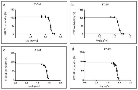 Cell viability of HTB75 (a,b) and HTB161 (c,d) cells following treatment with F5-SM and F7-SM at different concentrations for IC50 values at 48 h calculation from 5P logistic curve fit using GraphPad Prism version 6.1. Concentration 0 was the vehicle-treated control (2.50% and 3.50% v/v methanol for HTB75 and HTB161 respectively). Error bars indicate ± SE (n = 3).