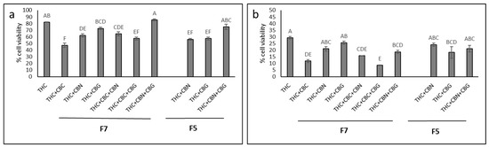 Cell viability of HTB75 cells following treatment with THC or with combinations of THC, CBG, CBC and CBN as in F7 or F5, at total concentrations of (a) 13 and (b) 15 µg/mL (treatments are listed in Supplementary Table S3). Cell viability was determined by XTT assay as a function of live cell number at 48 h. All calculations were in relation to the control (the vehicle treated control of 1.30% and 1.50% v/v methanol for a and b, respectively) that was considered to have 100% cell viability (not shown). Error bars indicate ± SE (n = 3). Levels with different Upper case letters were significantly different from all combinations of pairs by Tukey–Kramer honest significant difference (HSD; p ≤ 0.05).