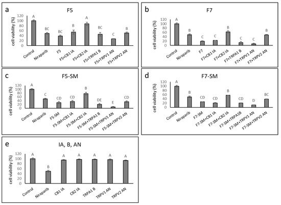 Cell viability of HTB75 cells following treatment with F5 (a), F7 (b), F5-SM (c) or F7-SM (d), with or without CB1 and CB2 inverse agonists (IA), a TRPA1 blocker (B), and TRPV1 or TRPV2 antagonists (AN) for 48 h. Cells were treated with F5 (19.1 µg/mL), F7 (19.4 µg/mL), F5-SM (14.7 µg/mL) or F7-SM (13.6 µg/mL), with or without the receptor IA, B or AN (10 µM). (e) The effects of IA, B or AN on viability of cells. Cell viability was determined by XTT assay at 48 h as a function of live cell number. Niraparib (6 µg/mL) served as a positive control. Control was vehicle control (1.47% v/v methanol + 1.00% v/v DMSO). Error bars indicate ± SE (n = 3). Levels with different Upper case letters were significantly different from all combinations of pairs according to the Tukey–Kramer honest significant difference (HSD; p ≤ 0.05).