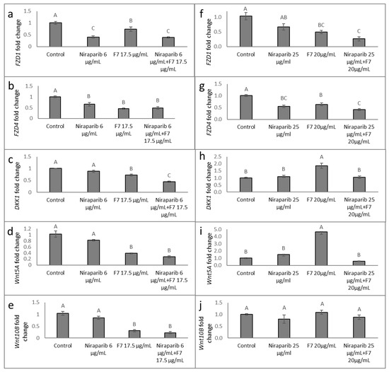 Quantitative PCR-based determination of the RNA steady state level in HTB75 (a–e) and HTB161 (f–j) cell lines of members of the FZD, DKK or Wnt gene families at 6 h of treatment with niraparib, F7, or a combination of niraparib+F7 relative to control. Gene transcript values were determined by quantitative PCR as a difference between the target gene versus a reference gene (HPRT). Values were calculated relative to the average expression of target genes in treated versus control using the 2−ΔΔCt method. Control was the vehicle control (1.00% v/v methanol + 0.60% v/v DMSO). Error bars indicate ± S.E. (n = 3). Levels with different Upper case letters with the same font and style were significantly different from all combinations of pairs by Tukey-Kramer honest significant difference (HSD; p ≤ 0.05).