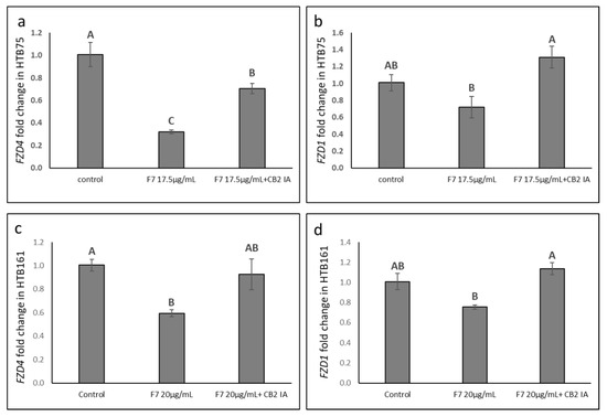 Quantitative PCR-based determination of the RNA steady state level in HTB75 (a,b) and HTB161 (c,d) cell lines of FZD4 and FZD1 genes at 6 h of treatment with F7 or F7+CB2 IA, relative to control. Gene transcript values were determined by quantitative PCR as a difference between the target gene versus a reference gene (HPRT). Values were calculated relative to the average expression of target genes in treated versus control using the 2−ΔΔCt method. Control was the vehicle control (1.00% v/v methanol + 0.10% v/v DMSO). Error bars indicate ± S.E. (n = 3). Levels with different Upper case letters were significantly different from all combinations of pairs by Tukey-Kramer honest significant difference (HSD; p ≤ 0.05).
