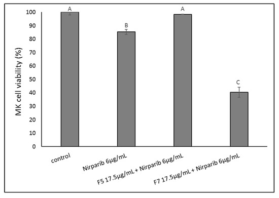 Cell viability of MK cells following treatment with niraparib, niraparib+F5 or niraparib+F7. Cell viability was determined by XTT assay at 48 h as a function of live cell number. Control was vehicle control (1.00% v/v methanol + 0.60% v/v DMSO). Error bars indicate ± SE (n = 2). Levels with different Upper case letters were significantly different from all combinations of pairs by Tukey–Kramer honest significant difference (HSD; p ≤ 0.05).