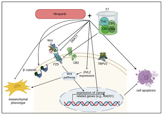 A suggested, simplified model for F7 and niraparib activity in OC cells in relation to the Wnt pathway. F7, niraparib or niraparib+F7 treatments significantly reduced FZD4 and FZD1 expression. This activity for F7 was partially dependent on CB2 activation. The expression of Wnt was altered by the treatments. Treatment with F7 also increased DKK1 expression in one of the examined cell lines. DKK1 inhibited the dimerization of FZD (with LRP5/6 receptor, not shown), directly preventing FZD activation. As a possible result of the alterations of the canonical Wnt signaling pathway, mesenchymal phenotype was inhibited, DVL2 and RAD51 expression was reduced and cell apoptosis was induced. Wnt, wingless/int1; FZD, Frizzled; DKK, Dickkopf; DVL2, Dishevelled2; RAD51, recombinase Rad51; THC, Δ9–tetrahydrocannabinol; CBC, cannabichromene; CBG, cannabigerol; CBN, cannabinol. Created with BioRender.com (accessed on 12 October 2022).