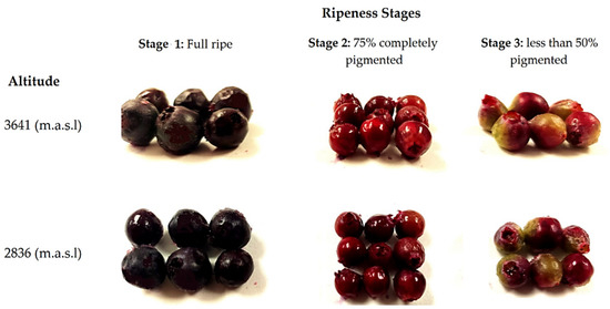 In each zone, three batches of 0.1 kg of fruits without damage (physical, physiological, or pathogenic) were randomly collected from different plants. We also considered the stage of ripeness based on their pigmentation (stage 1: fully ripe, stage 2: 75% to completely pigmented, and stage 3: less than 50% pigmented). During fruit ripening, color changes occurred: black when it is ripe for consumption (stage 1), pink when it is physiologically mature (stage 2), and green when it is not yet ripe (stage 3) [25]. No differences were identified in terms of the size and shape of the fruits from the same stage of maturity between both altitudes, as shown in Figure 1. The fruits were carefully transported from the harvest site to the laboratory in a period of no longer than 24 h (3 h for fruit harvesting in Zuleta and no more than 5 h for fruit harvesting in La Paz). Once in the laboratory, the fruits were selected by removing those that suffered any damage during transport (e.g., drained or broken). Next, the selected fruits from different plants collected at the same altitude and at the same stage of ripeness were pooled (6 pools were formed: three stages and two altitudes) and immediately frozen for 48 h at −80 °C. After this process, the pools were lyophilized and ground to a fine powder using an analytical mill (IKA A11 basic, Germany). The pools’ powder was kept in a vacuum in the dark and at a temperature of −80 °C until compositional analysis (no more than 4 months from its preparation). Before the analysis, three independent extractions were made from each pool.