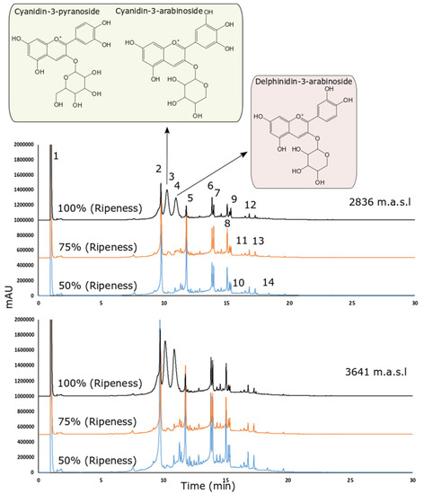 Figure 2 shows the chromatograms obtained under different altitudes and ripening stages. All tentatively identified peaks (shown in Figure 2) are presented in Table 3 based on the MS2 fragmentation patterns and their (pseudo) molecular ions, for which we relied on the available bibliography and our chromatographic peak library.