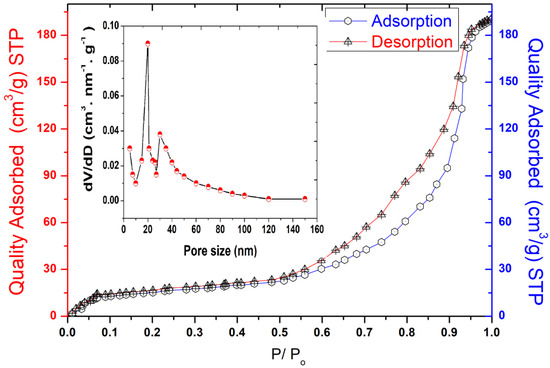 The obtained results show that the BET curve fits the type IV isotherm according to the classification of the IPUAC, with an H3 hysteresis loop ranging between 0.50 and 0.90 relative pressure (P/P0), indicating that this support has a typical mesoporous structure enhanced by the presence of meso and macroporous morphologies on its surface. The specific surface area of Tamazert kaolin was found to be 31.2 m2 g−1, and the pore size distribution was reported to be in the range of 5–15 nm, as shown in Figure 2.