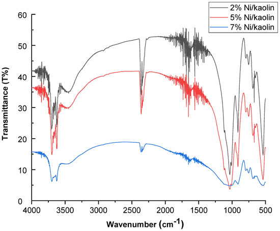FT-IR spectra for 2%, 5%, and 7% Ni/kaolin are represented in Figure 3.