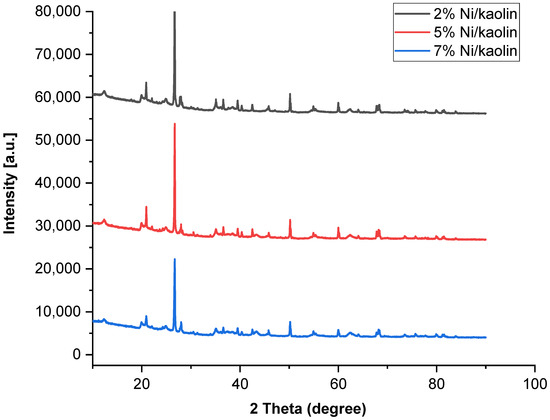 Structural modifications occurring in the treated kaolin were studied using the X-ray diffraction technique. The XRD patterns were recorded in the range of 10–90°. Figure 4 shows the XRD profiles of catalysts (2%, 5%, and 7% Ni/kaolin).