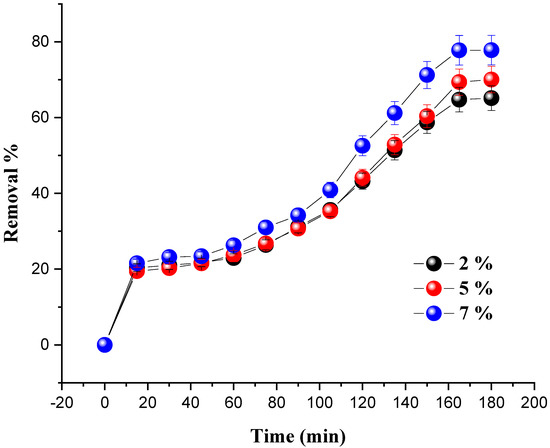 To elucidate the effect of metal loading on the catalytic performance of the prepared catalysts, different amounts of Ni/kaolin (2 wt.%, 5 wt.%, and 7 wt.%) were loaded at varied time intervals in order for the dye to reach its removal percentage by keeping a constant weight of the catalyst (0.2 g), while progressively increasing the contact time. Every 15 min, a small sample of the reaction mixture was centrifuged for 10 min before the absorbance was measured with a UV-Vis spectrophotometer. The influence of the percentage of nickel loading on dye removal is shown in Figure 5.