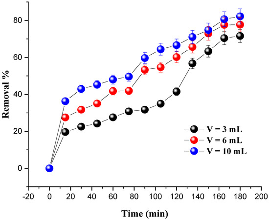 The effect of H2O2 dosage on MG degradation was assessed by adding several H2O2 volumes (3 mL, 6 mL, and 10 mL) under the following conditions: the amount of catalyst was set at 0.8 g and the dye concentration at 20 mg/L; the pH of the solutions was set at 7 and the temperature at 25 °C. The results are presented in Figure 7.