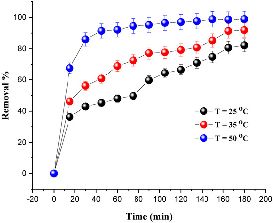 The influence of the temperature was studied in the temperature range of 25–50 °C and under the following operating conditions: a mass of catalyst of 0.8 g; a dye concentration of 20 mg/L; and 10 mL of H2O2. To keep the temperature at the target value, a stirring plate and a thermometer were used.