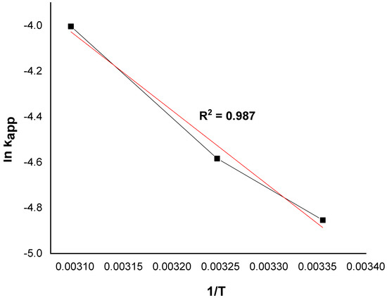 The value of the activation energy was calculated from the regression slope (line of lnkapp as a function of 1/T), as illustrated in Figure 10.