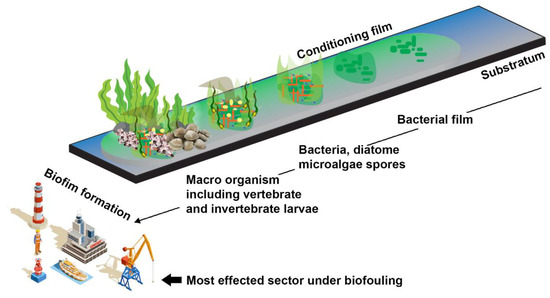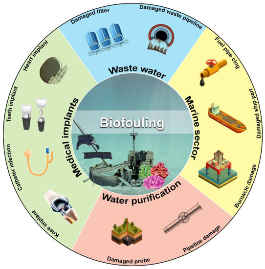 Biofilm buildup in ship hulls and pipelines especially submerged infrastructure has the most significant economic loss due to biofouling (Figure 1). Various approaches are currently being used to mitigate the financial loss mediated by biofouling. These include hull cleaning, sealing, and repainting. However, these approaches are not economical and cost more than $250 million annually [24]. Industrial equipment and engines with macrofouling significantly impact marine environments, potentially reducing heat transfer efficiency. It reduces water flow and increases biomass beneath aquaculture plants, increasing the risk of fish illness [25,26]. Since a coastal power plant requires a large amount of cooling water via submerged pipelines, biofouling impacts the smooth flow of water to heat exchangers. Subsequently, invertebrate larvae and other higher-order creatures breed on the heat exchanger walls, where a layer of bacteria has formed [18]. Macrofouling is influenced by local hydrodynamics and the environment. As a result of biofouling, the heat transfer module loses efficiency and becomes an insulating chamber. Biofouling also interferes with membrane separation systems used in water purification. Membrane biofilm increases membrane resistance during reverse osmosis, decreasing water flow.