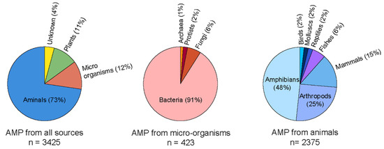 Current status of the natural AMPs to date as per AMP database. The circular pi charts were generated by data obtained from APD3 database [5].