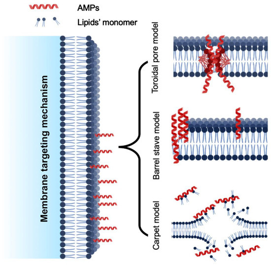 Various models of cell membrane targeting mechanism of AMPs.