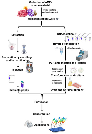 A generalized schematic workflow for the isolation and purification of antimicrobial peptides. A natural extraction from a native source employs extraction, partitioning, and chromatography steps, while recombinant peptide production includes mRNA isolation, cDNA preparation, cloning, and overexpression of peptide encoding gene. The recombinant peptide can be purified easily using affinity chromatography. (Figure credit Freepik.com, accessed on 27 October 2022).
