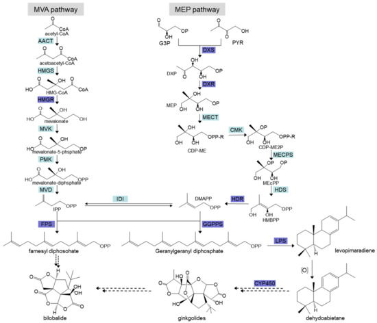 G. biloba is the only surviving representative of Ginkgoaceae, which originated approximately 280 million years ago. It is an important economic tree species with economic, ornamental, and medicinal values [1]. G. biloba extract can relieve asthma, activate blood circulation, remove blood stasis, and relieve pain. It is used to treat coronary heart disease, angina pectoris, hyperlipidemia, and so on. Various drugs manufactured from G. biloba leaves and seeds have been widely found in pharmacies and hospitals (e.g., dipyridamole injections), whose main bioactive components are ginkgolides and flavonoids, have been widely used in the clinical treatment of cardiovascular and cerebrovascular diseases [2]. TTLs mainly include ginkgolides A, B, C, M, and bilobalide. Ginkgolides have the physiological functions of antioxidation, they antagonize active platelet factors, they protect the nervous system, they are anti-inflammatory, they prevent tumors, and so on [3]; however, the TTL content of G. biloba is quite low, and it fails to meet the demands of pharmaceutical production [4]. Ginkgolides are terpenoids, and there are two main pathways involved in their precursor biosynthesis, including the mevalonate (MVA) pathway in the cytoplasm and the 2-C-methyl-d-erythritol-4-phosphate (MEP) pathway in the plastids [5]. At present, it is believed that the biosynthesis of ginkgolide precursors mainly occurs through the MVA pathway, and the biosynthesis of the ginkgo diterpene lactone precursors mainly occur through the MEP pathway (Figure 1) [6]. In the MEP pathway, DXS, DXR, HDR, LPS, CYP450, and other genes are considered to be the key enzyme genes regulating ginkgolide synthesis [7,8,9]. Most genes involved with the ginkgolide biosynthesis pathway have been cloned, among which, the more important genes are GbHMGR, GbDXS, GbDXR, GbHDR, GbGGPPS, GbFPS, and GbLPS. GbHMGR belongs to a small gene family, and its gene expression is tissue specific. It is only expressed at a low level in the root and it is induced by phytohormones such as JA [10,11]. GbDXS also plays an important role in the biosynthesis of ginkgolides, and it is only expressed in the radicle [8]. Tissue expression analysis showed that the expression level of GbDXR in roots was higher than that in leaves, which further proved that ginkgolides were biosynthetic in roots [7,8].