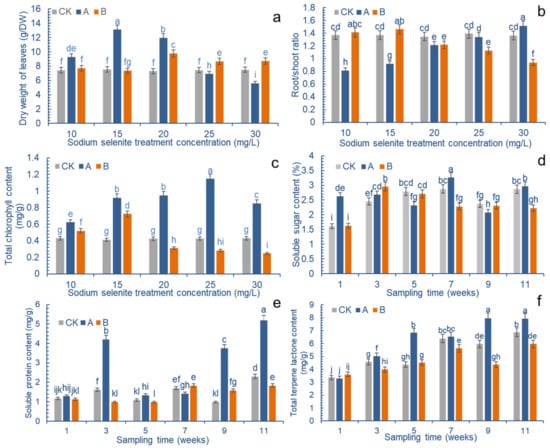 Na2SeO3 was prepared into a 10, 15, 20, 25, 30 mg/L aqueous solution, and it was treated with foliar spraying (group A) and root irrigation (group B). The leaves were sprayed until they dripped, and the root treatments were irrigated with 500 mL per pot. Tween 80, at 0.01%, was added to the Na2SeO3 solution that was sprayed on the foliar, and the control group (group CK) was replaced with distilled water. After 12 weeks, the biomass, root to shoot ratio, and chlorophyll content were measured. In accordance with a previous study, 20 mg/L of a Na2SeO3 aqueous solution was selected for leaf spraying (group A) and root irrigation (group B); it would be used for the same treatment on the leaves and roots, respectively. Samples were taken every 2 weeks to determine the changes in soluble sugar, soluble protein and terpene lactone content.