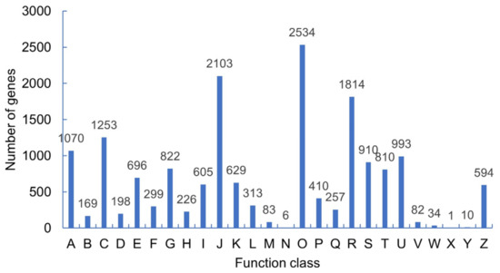 KOG classification of the DEGs. (A) Processing and modifying RNA; (B) chromosome structure and changes; (C) energy generation and transformation; (D) cell cycle regulation, division, and chromosome rearrangement; (E) amino acid transport and metabolism; (F) nucleotide transport and metabolism; (G) carbohydrate transport and metabolism; (H) coenzyme transport and metabolism; (I) lipid transport and metabolism; (J) translation, ribosome structure, and biosynthesis; (K) transcription; (L) replication, reorganization, and repair; (M) cell wall and membrane biosynthesis; (N) cell movement; (O) post translational modification, protein foldings and molecular chaperone; (P) inorganic ion transport and metabolism; (Q) synthesis, transportation, and metabolism of secondary metabolites; (R) general function prediction; (S) unknown function; (T) signal transduction mechanism; (U) intracellular transport, secretion, and vesicular transport; (V) defense mechanism; (W) extracellular movement; (X) unnamed protein; (Y) nucleic acid structure; and (Z) cytoskeleton.