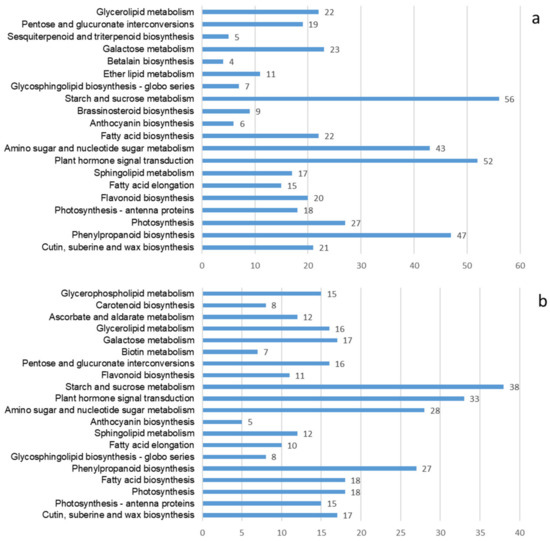 Annotation analysis of the KEGG pathway of differentially expressed genes in ginkgo leaves treated with Na2SeO3. (a) Group A vs. CK; (b) group B vs. CK. Note: CK control group; A—foliar spraying; B—root pouring.